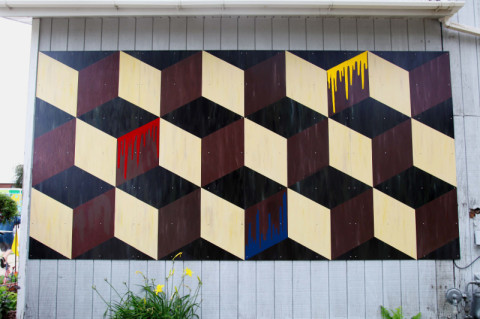 One way to approach this mural is to imagine the landscape of Central Wisconsin in October, as seen from 10,000 feet, boiled down to its essential elements: shapes, colors, borders. The plots