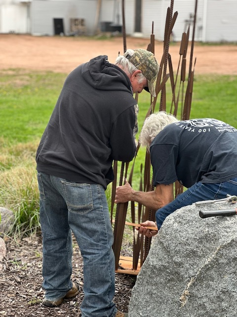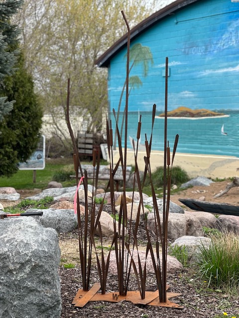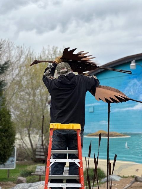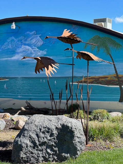 The rustic metal sculpture of cranes over cattails entitled "Taking Flight" by Vic Rouleau was installed in May, 2024 in the Art Park. The purchase of this sculpture was made possible from the proceeds of WOW's Dueling Pianos Event that is held every February at the WOWSPACE. Drop by and take a look at our cranes taking flight!