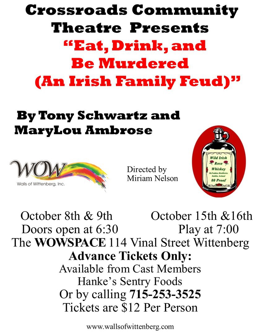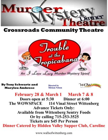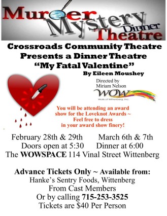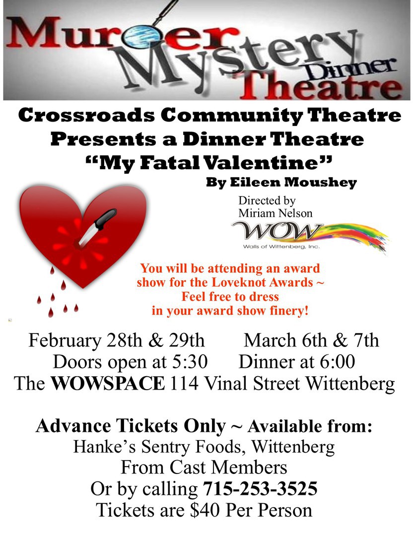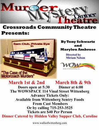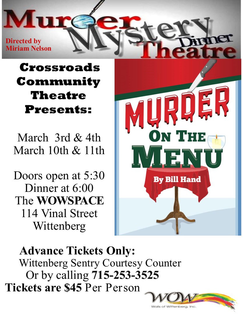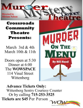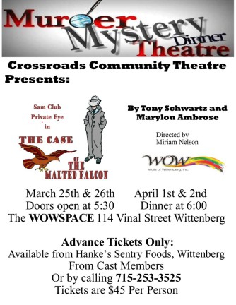 February 22nd & 23rd and March 1st & 2nd, 2019 Murder Mystery Dinner Theatre - “Murder at the Tonylou Awards” by Tony Schwartz and Mary Lou Amborse on Fridays and @ the WOWSPACE. About 50 people joined us each night at the WOWSPACE for a marvelous meal, mayhem, mystery, and of course a murder! Several nights were sold out. This event has become an annual favorite for many area sleuths. Tickets were $40 – purchased in advance by calling 715-253-3525 or by dropping by Your Community Shopper where you never know what famous actor you might bump into!