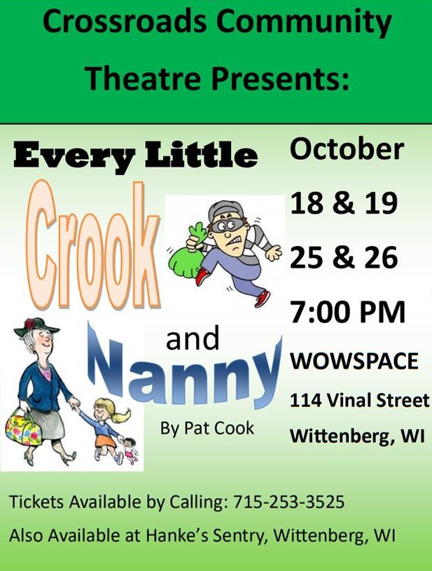 October 18th & 19th and 25th & 26th, 2019 Fall Theatre Production - “Every Little Crook and Nanny” by Pat Cook @ the WOWSPACE @ 7 p.m. Tickets were $10 – purchased in advance by calling 715-253-3525 or by dropping by Hanke's Sentry Foods store. The audience definitely got their laughs out of this one! This was another splendid production by our local talent!