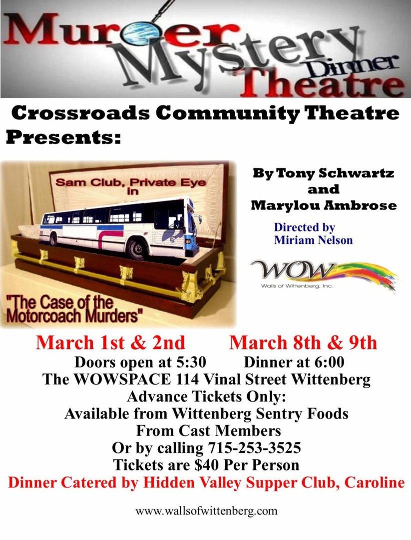 February 20, 21, 27 & 28, 2015: Crossroads Community Theatre returned with their 4th murder mystery dinner theatre event: "Talk About a Murder" by Lee Mueller. Mystery solved! Delicious food eaten! Delightful evening!