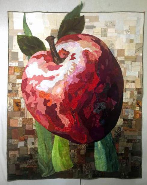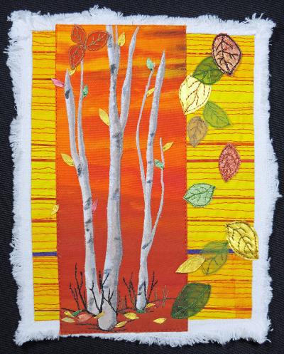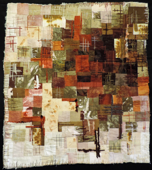 Daily play with fiber and quiet time in my studio brings focus and solace; initial ideas percolate. Studio walls are festooned with yarns, fabrics, and silks. Photographs, emotions and simple observation begin artworks. I create elements often from scrap bins for assembly. On two large design walls, snippets constantly shift until the rhythm and balance gel. Construction is frequently by hand, slowly soothing the creative muse.