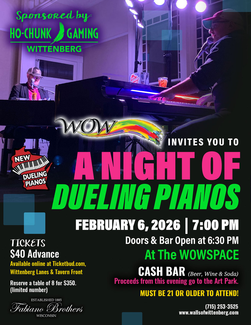 Friday, February 8th, 2019: DUELING PIANOS was held once again. Another sold out event! The NorthEast WI Dueling Piano entertainers the N.E.W. PIANO GUYS will dazzled the attendees with tunes from Billy Joel to Bon Jovi to Britney Spears to Buno Mars....perfect combination of concert, comedy & creativity! This was a fundraiser for the Art Park and WOW is very thankful for all those that supported our event.