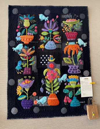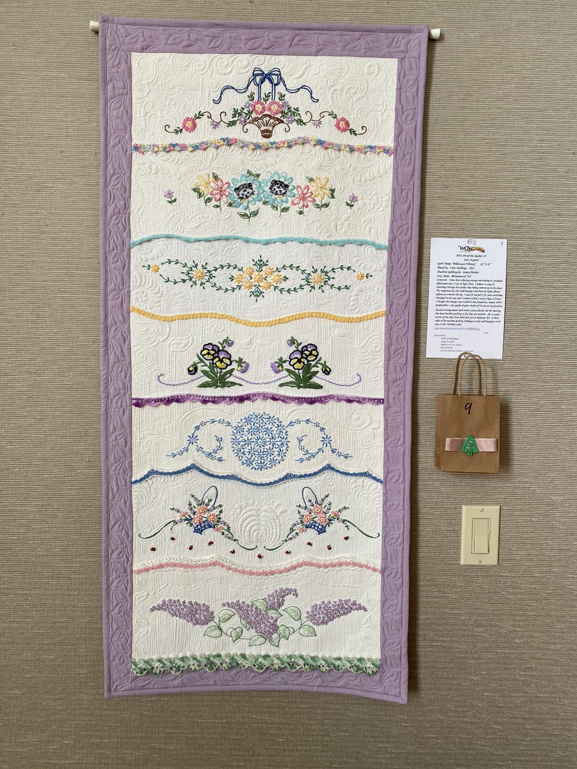 Rose Grych of Wausau, WI received the Award of Excellence for her quilt titled My Fresh Cut Flower Garden. Rose’s quilt was a colorful wool applique embellished with intricate embroidery. This award recognizes the high level of technical skill and difficulty employed by the quilter. The recipient is chosen by local quilt club quilters with entries in the show.