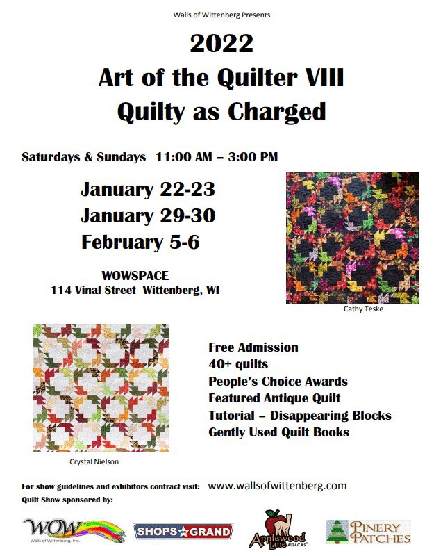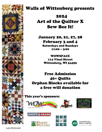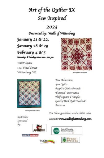 Quilters near and far! We invite you to participate in our 10th open quilt show at the WOWSPACE in Wittenberg, WI. This is a non-juried, non-judged show. 1st, 2nd, and 3rd place People’s Choice awards and an Award of Excellence will be given.