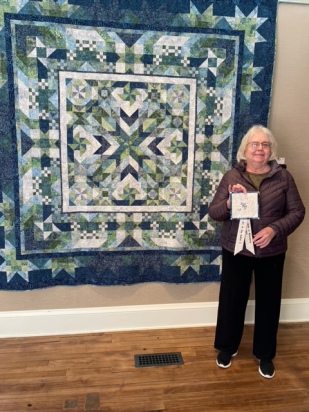 1st place went to Linda Peterson of Weston, WI for Lakeshore. Linda’s quilt employed soft hues of blue and green batiks in a complicated overall design which incorporated many traditional block patterns.