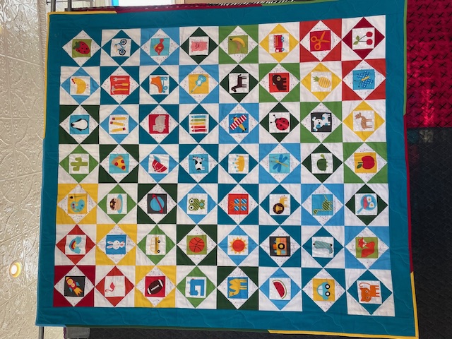 1st place went to Rachele Wamboldt of Eland, WI for Classic Mario. This quilt was made from an overwhelming number of one inch squares which gave it the pixelated appearance of this classic video game offering a real twist on the traditional “postage stamp” quilt.