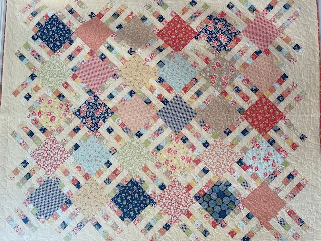 2nd place was awarded to Kathleen Vuchetich of Minocqua, WI for Red and White. This striking quilt paired a simple flying geese pattern in reds, pinks and white with an extremely complex quilting design.