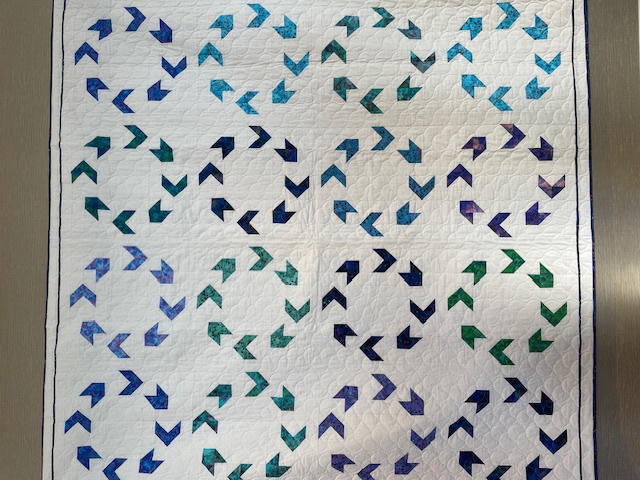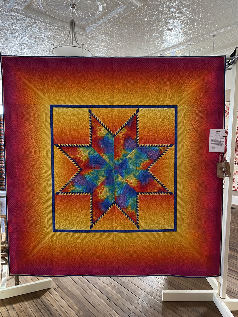 The Award of Excellence went to Julie Lambert of Weston, WI for her quilt titled Feathered Star. Julie’s quilt featured a difficult star pattern with perfect points, intricate quilting done on a standard sewing machine, a binding flange, and ombre background color. This award recognizes the high level of technical skill and difficulty employed by the quilter. The recipient is chosen by local quilt club quilters with entries in the show.