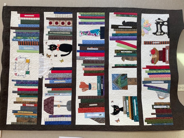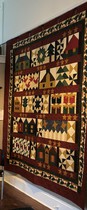 3rd place was awarded to Barb Boettcher of Crivitz, WI for My Quilt of Life. Incorporating a sampler of colorful pieced blocks of varying sizes appliqued with silhouettes in black, her quilt commemorates many significant events that have made up her life thus far.