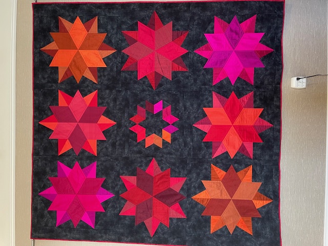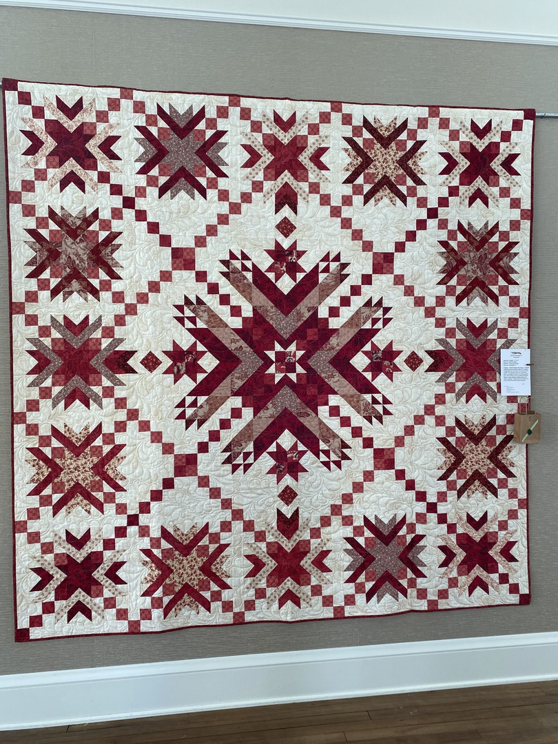 2nd place was awarded to Mary Beth Koeppel of Wittenberg, WI for Big Red. Her quilt featured a large center star surrounded by similar smaller stars in a variety of deep reds.