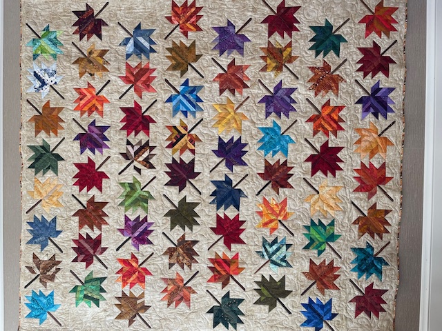 First place quilt was "Caring Friends and Gentle Hands" by the Quilting Friends of Hatley. Second place went to Sonia Miller for "A Prophecy in Silk and Cotton" (bright pink stars on black background.) Third place was "Falling Maple Leaves" by Terry Hillman and Pine Tree Quilters. The award of excellence went to Mary Koeppel for her quilt "Pinafores and Pinwheels."