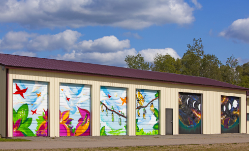 Last fall when I received a message from WOW about possibly doing a mural in Wittenberg. WOW reached out to me after talking with Alicia Rheal, another muralist who had done previous works for the WOW. Alicia and I collaborated on a mural project for the University of Wisconsin-Madison and Zion City church two summers ago. Alicia and I hit it off immediately--exchanging experiences and knowledge between my approach to aerosol artistry, and Alicia's mastery as a brush artist. I knew that anyone Alicia had worked with would have a great vibe. I was told that Wittenberg was looking to have a graffiti oriented mural for the town and sent the pictures of the garage doors which would serve as the canvas. I was really excited to return to Wisconsin, and especially to join the cohort of artists that had brought their distinct creative approaches to the murals of Wittenberg.