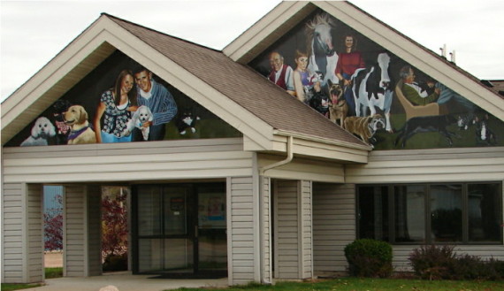 Kelly Meredith, artist from Butternut, Wisc., has captured portraits of pets - from cats to cows -- and thier owners on three gables of the clinic.