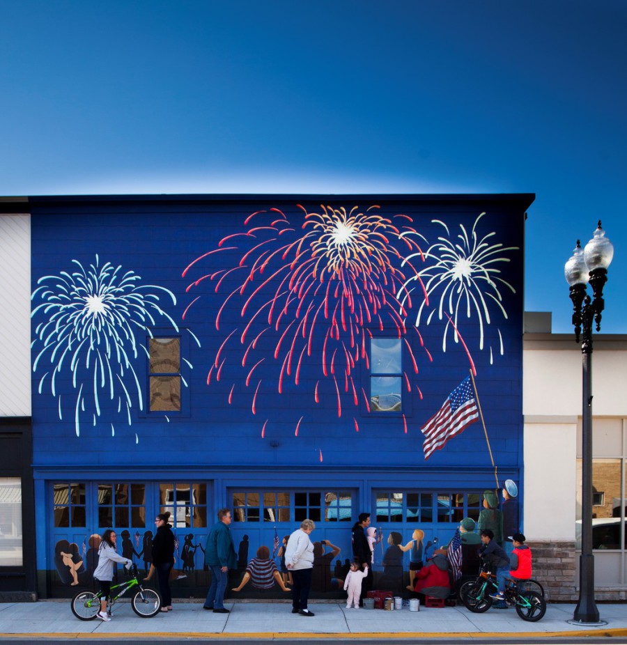 When WOW showed me the building on Webb Street and told me they wanted a mural depicting Wittenberg’s love for fireworks, I immediately envisioned the entire building turned into the night sky of the Fourth of July. Of course, if you’re going to have fireworks, you have to have a crowd of people watching them! The three garage doors with their rows of windows, brought an added challenge. I felt that by covering the entire building with a deep blue and putting the crowd in front, the doors and windows would in effect, disappear. It seems to have worked even better than I imagined. A special thanks to Andy Goretski for his assistance and especially for doing such a fantastic job painting all the flags. This has been a fun mural to paint and I am glad to be the one that has made every day the Fourth of July in downtown Wittenberg!