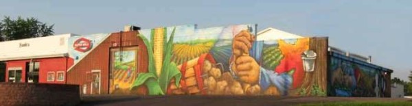 The walls of the former Hanke's Super Valu on Reed Street (now a laundromat) explode with color, celebrating the rich agricultural history of our area. The Painted Ladies of Madison, WI created this mural. Agriculture and art students at Wittenberg/Birnamwood High School brainstormed with the artists to plan the mural. A summer school art class joined the Painted Ladies in executing the mural. The Hanke family, past and present, greet you as does Floyd Doering, a leader in the FFA locally, in the state and nationally. This was completed in the summer of 2007.