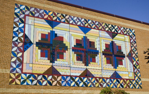 The strength of a community's fabric is dependent on the sturdiness of the interwoven threads. Consider the many threads of The Community Quilt. First, Bonnie Bell's art students at Wittenberg-Birnamwood High School worked together with Ms. Bell; Alicia Rheal, (Madison artist); Caroline Glover, (expert quilter) and Linda Pontefract, (quilter and local artist) to create the quilt design -- a variation of the log cabin pattern.
